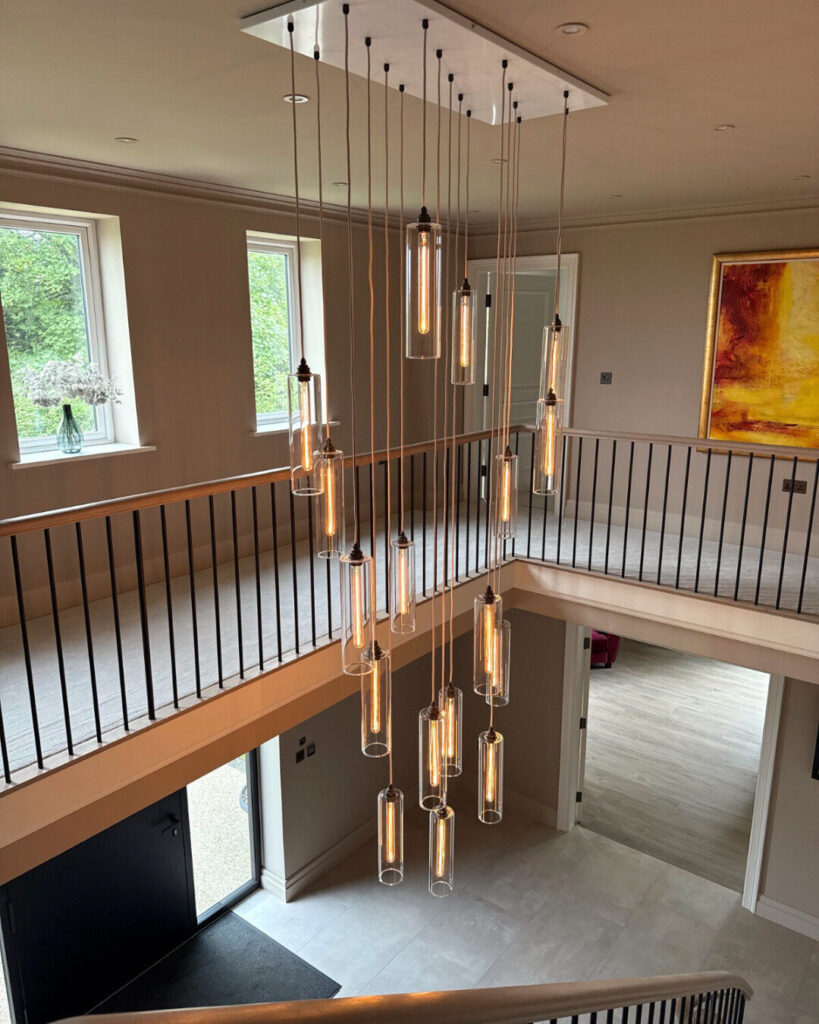 A perfectly placed light can makeover a room acutely but in this transitional space, our Piccadilly fitting transforms the entire home for a compelling, fresh finish. Warm, golden light and a scintillating cascade of clear glass shades all come together for a terrific conversation-starting piece.